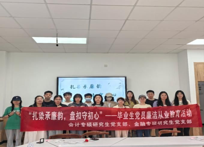 4月11日,四虎影院 会计专硕研究生党支部联合金融专硕研究生党支部在曹光彪楼216教室开展“扎染承廉韵,盘扣守初心”毕业生党员廉洁从业教育活动。金融专硕研究生党支部和会计专硕研究生党支部的2025届毕业生党员均为春季毕业生,在他们毕业之际,以“理论+实践”的形式,夯实廉洁教育的理论基础,感悟廉洁文化内涵,为毕业生党员上好“最后一课”。