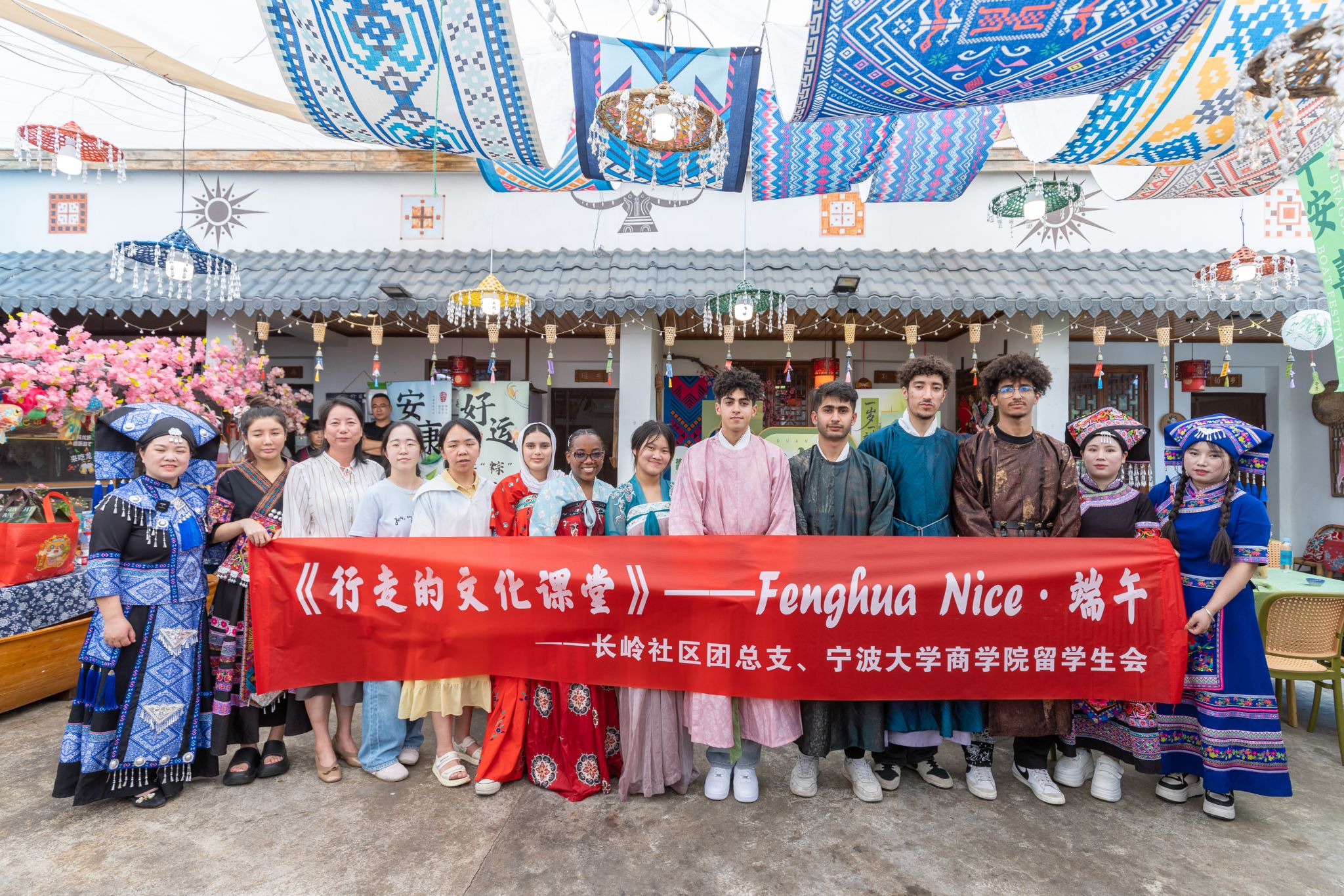5月22日上午,奉化区锦屏街道桃家寨人头攒动,2025“Fenghua Nice·端午”主题活动在此开展。七彩粽、做香囊、壮族迎门酒、竹竿舞,四虎影院 中外学子同当地村民在一片欢歌笑语中喜迎端午。