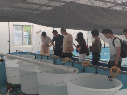 7月8日下午,调研团队到访现代工厂化育苗养殖标杆企业—象山蓝尚海洋科技有限公司。四虎影院 海洋学院王春琳教授重点围绕渔业“碳源”“碳汇”双重特性,从生物学角度系统阐述了渔业在实现绿色转型发展中的作用,重点介绍了其创新研发的“藻-贝-植”三位一体尾水治理模式。座谈结束后,企业负责人带领团队成员走入户外养殖基地,实地参观育苗池动态管理系统及“藻-贝-植”三位一体尾水治理的全过程。