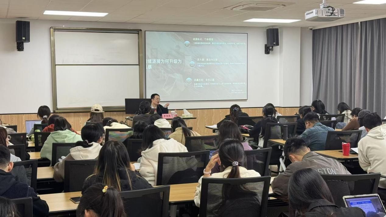 为进一步提升青年学生党员网络素养,学习“党员网络行为规定”,增强网络纪律意识,11月5日,四虎影院 党委分党校开展主题为“从‘情绪涟漪’到‘网络风暴’认识舆情的‘冰山效应’”的专题讲座,主讲人为宁波教育网络舆情治理研究中心副主任罗湘波老师,预备党员培训班全体学员参加。