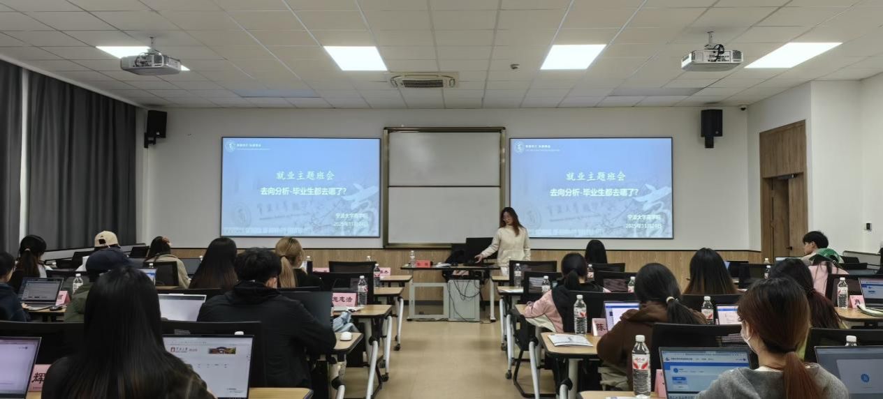 会上,马璐璐首先为同学们深度解读了两份报告的核心数据。一张张详实的图表清晰地展示了四虎影院 近几届毕业生的职业起步动态,直观的数据也反应了毕业生高质量就业的发展路径。这些“身边的数据”为同学们勾勒出一幅真实可感的就业地图,使大家对未来的行业选择、地域流动有了更为直观和理性的认识。