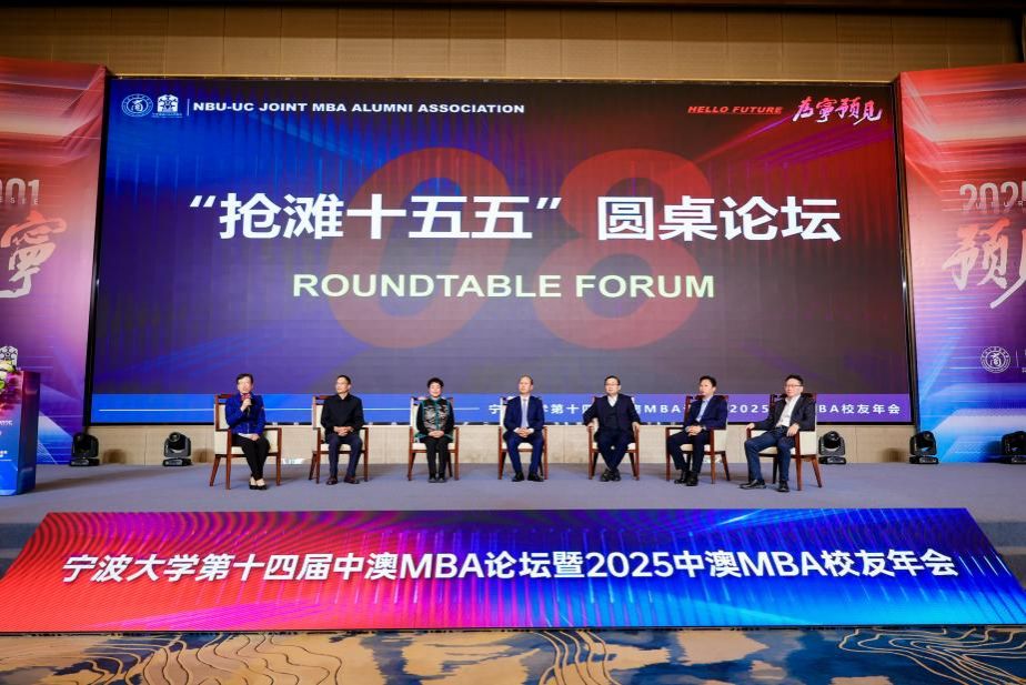 短暂的茶歇过后,是精彩的圆桌对话。本次圆桌论坛由中澳MBA项目创始人、宁波会计学会名誉会长邱妘主持,邀请了浙江省信用协会会长、浙江省发改委原副主任谢晓波,长阳科技董事长、宁波市北京大学校友会会长金亚东,创合汇资本管理合伙人王一,新芝生物董事长、宁波浙江大学校友会副会长周芳,宁波市人大常委会预算工作委员会主任竺培楠,美康生物董事长、2025级中澳MBA校友邹炳德,围绕“抢滩十五五:产业新局与价值创造”展开讨论。