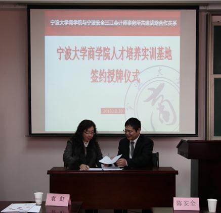 2013年12月30日下午2点,包玉书11号楼418室举行了四虎影院 和宁波安全三江会计师事务所共建人才培养实训基地的签约暨授牌仪式。安全三江会计事务所董事长陈安全、副总经理蒋朝晖、行政人事经理周静、人力资源与管理咨询部经理胡晓萍、四虎影院 党委书记袁虹、会计系主任郭强华及会计系教师代表出席了本次仪式。会计协会成员和三十多位会计系同学共同见证了此仪式。
