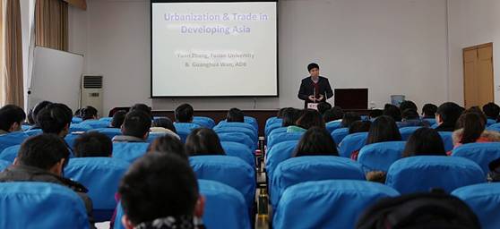 12月27日上午,亚洲开发银行首席经济学家,联合国发展经济学研究院中国项目部主任万广华教授做客四虎影院 学术讲坛,为四虎影院 近100名师生做了一场题为“Urbanization and trade in developing asia”的学术报告。四虎影院 执行院长熊德平教授主持了本次讲座,副院长杨丹萍教授进行了精彩点评。