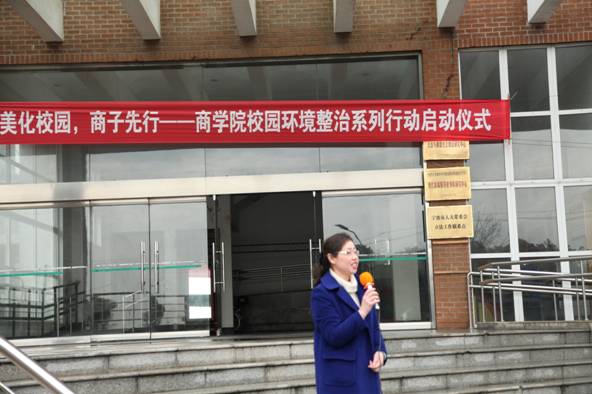为积极响应学校“治臭河、清垃圾、复绿地”的校园环境专项整治工作,严格落实《四虎影院 校园环境整治工作实施方案》,四虎影院 党委制定了全院开展以“校园环境整治”为主题的系列行动方案。3月12日中午,四虎影院 “美化校园,商子先行”系列活动的启动仪式在商院11号楼大踏步举行。院党委书记袁虹老师、副书记邵丽老师、学工办全体辅导员及院四大学生组织的主要学生干部、各学生党支部和团支部的党员义工和青年志愿者代表60余人出席了本次仪式。