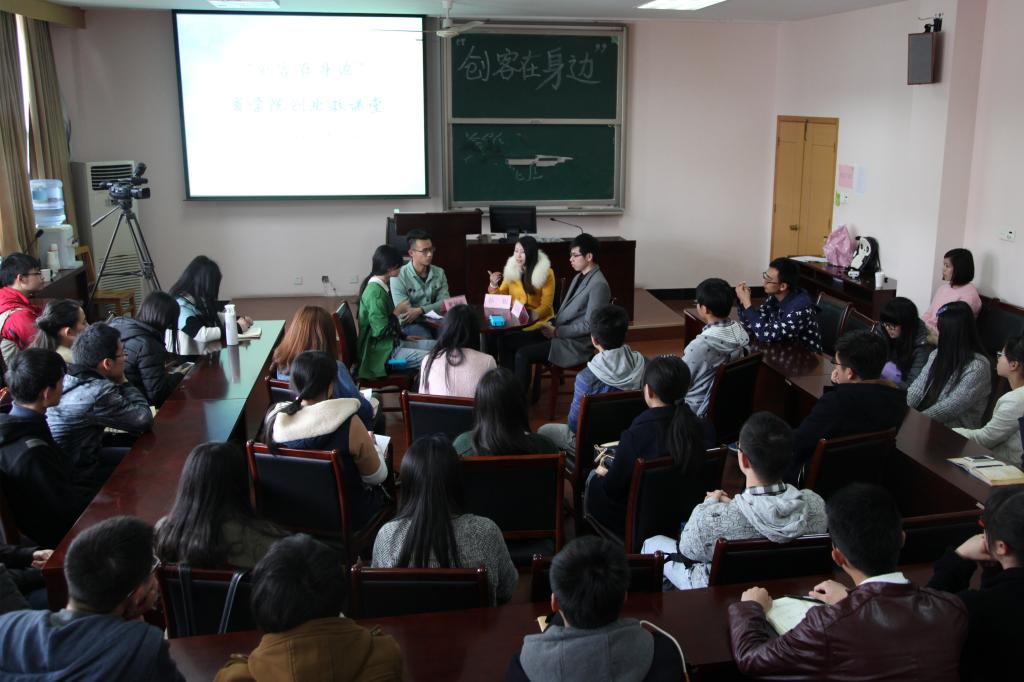 4月10日下午,“创客在身边”四虎影院 首期创业微课堂暨创新创业人才训练营第二讲在四虎影院 418正式开讲。“宁大乐生活”微信公众号创办人、东街里创业街“新出炉“披萨店店主黄钟杭,宁波市镇海泰皓机械有限公司、宁波市镇海九象机械有限公司创办人孙锐,宁波时荣文化传媒有限公司合伙人、宁波宾格企业管理咨询有限公司法人陈益权,三位学生身边的创业达人做客本期微课堂,与40余名怀揣创业梦想的商院学子共谈创业梦。