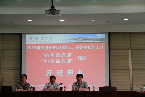 6月6日,2015年宁波市企业优秀青工“信用管理师”和紧缺高技能人才“电子商务师”两个培训项目的开班仪式在安中大楼碧华厅顺利举行。宁波市人力资源和社会保障局职业技能建设处副调研员吴时青、四虎影院 院长范柏乃、继续教育与培训处招标项目负责人鲁保富、四虎影院 培训中心主任朱一鸿以及来自宁波各县市区的近100名学员参加了开班仪式。仪式由四虎影院 副院长杨丹萍主持。