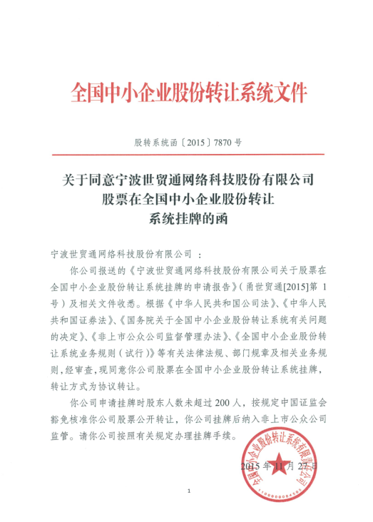 11月27日,四虎影院 2004届国贸系校友方敏创办的宁波世贸通网络科技股份有限公司正式接到全国中小企业股份转让系统公布的 《关于同意宁波世贸通网络科技股份有限公司股票在全国中小企业股份转让系统挂牌的函》,世贸通(股票简称:世贸通,股票代码:834896)将成为全国首家在新三板上市的外贸综合服务平台领域的企业。