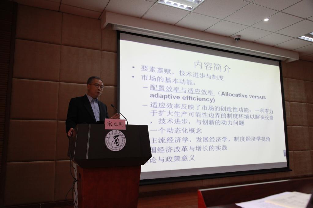 宋立刚教授从国家经济增长动力源泉的三个方面:要素禀赋、技术进步和制度入手,以市场配置效率和适应效率为切入点分析了当前中国经济的转型发展之路,对“企业家精神培育”、“市场竞争与创造性破坏”、“经济增长的源泉与机制”、“技术进步与市场非竞争性”等多方面内容作了详细探讨。他在报告中提出寻求新经济增长源泉与机制(技术内生化过程)的基础是全面发挥市场的基本功能既包括其配置效率又包括适应效率,市场适应效率的改善和配置效率的加强有赖于制度层面和政策层面上的改革与调整。主题报告结束后,宋教授与现场师生进行了互动和交流,并对师生提问给予了耐心回答,现场气氛热烈。