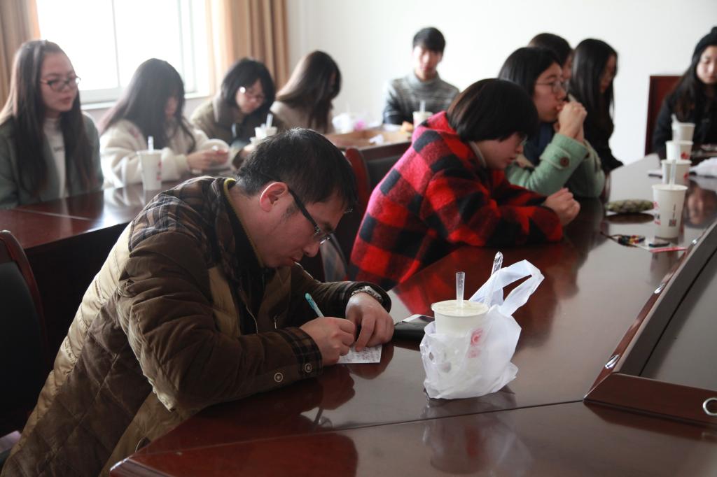 2015年12月31日中午,四虎影院 助理学期工作总结交流会在四虎影院 412会议室举行。学工办副主任汪杰峰和各办公室学生助理参加了此次交流会。此次交流会由学工办主任董璐主持。