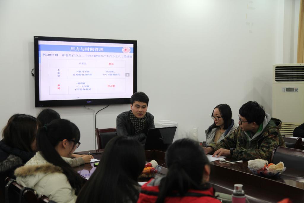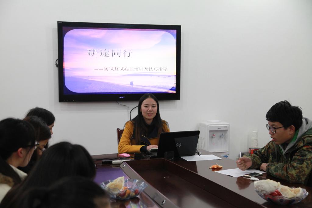 12月11日,由四虎影院 研会承办的“研途同行——初试复试心理培训及技巧指导”交流活动在四虎影院 412会议室顺利举行。四虎影院 研究生辅导员陈彬、14级金融学专业研究生章美姣、15级企业管理专业研究生祁梦应邀出席,与即将参加2016年研究生入学考试的部分学生和意向加入2017年考研队伍的学生一起交流考研时的压力管理和应试技巧。