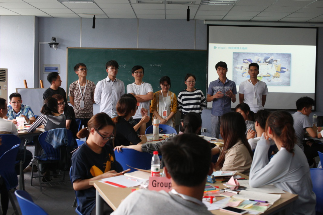 下午的课程分为“创业团队”模块和“创业思维”模块。“创业团队”模块,首先明确团队内涵,组建学生团队,最后设计团队练习。在“创业思维”模块,利用两个小游戏对比分析创业思维和管理思维,并指出:面对不确定性,小行动往往胜过大计划。