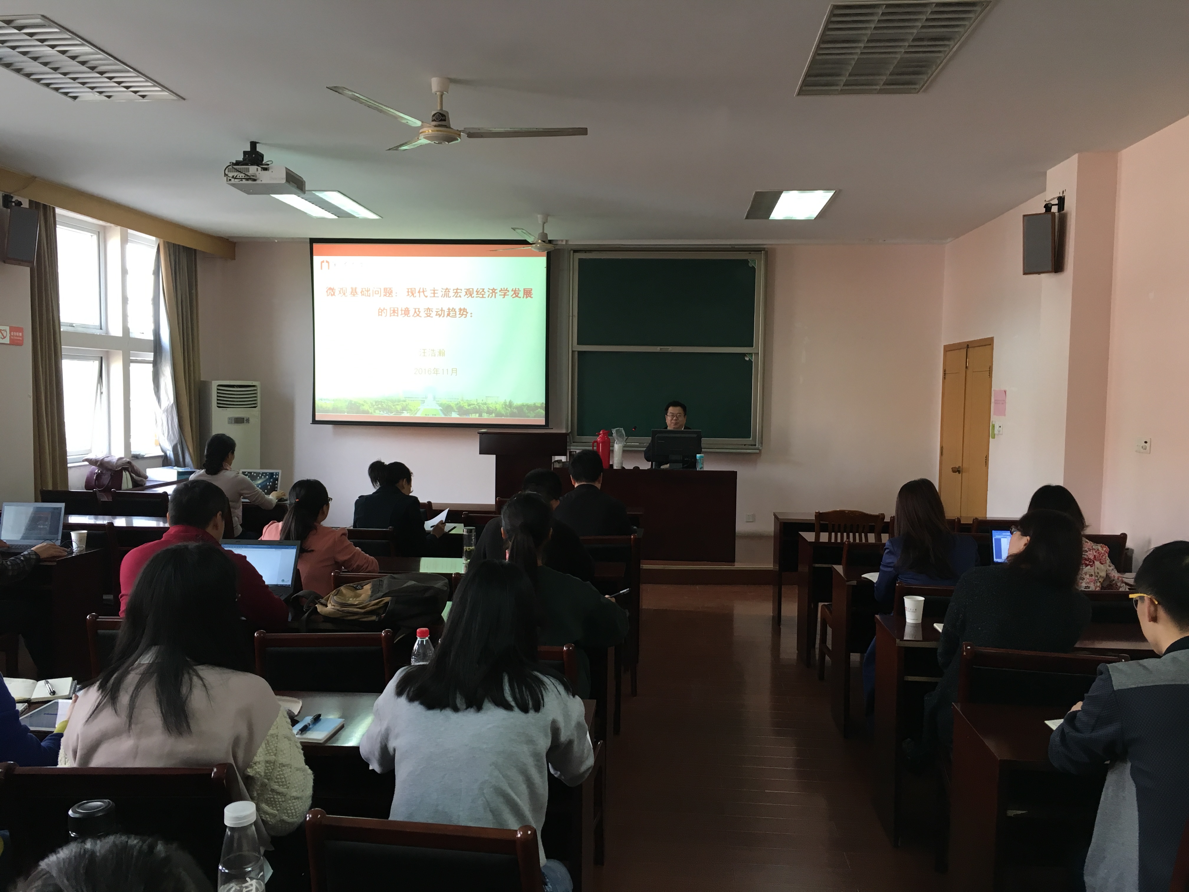 2016年11月16日上午,四虎影院 学术沙龙(2016年第11期)在11#418会议室举行。四虎影院 党委委员、产业经济研究所教授、博士生导师汪浩瀚做了题为《微观基础问题:现代主流宏观经济学发展的困境及变化趋势》的精彩学术报告。学术沙龙由产业经济研究所所长胡求光教授主持,四虎影院 院长助理陈涛教授以及四虎影院 师生50余人参加了此次学术活动。
