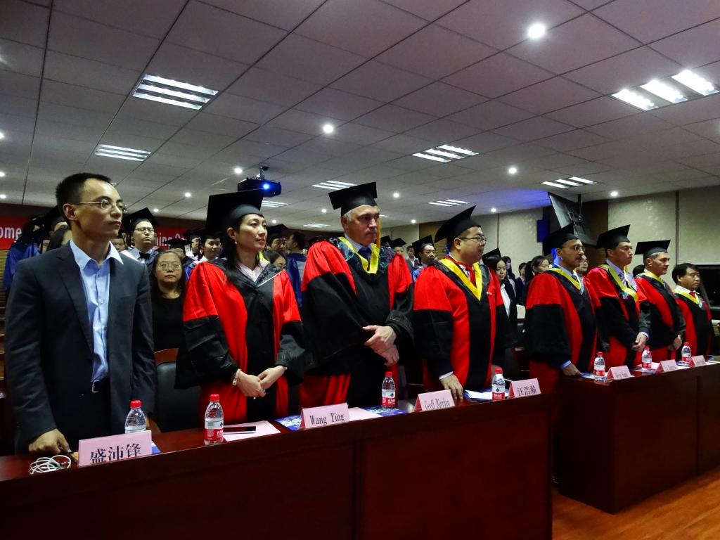 当晚八点,典礼开始。院长范柏乃教授以一句饱含热情的“Welcome!”向远道而来的澳方嘉宾和在场学员们致以诚挚的欢迎。在介绍完两校的出席嘉宾后,全体师生起立,现场奏响了中澳两国国歌。汪浩瀚教授代表四虎影院 发表了讲话。他肯定了宁大中澳MBA项目创办十六年来所取得的成果——从单纯的国外学位研修项目到受国家教育部认可的学位教育项目的提升和转变。他指出我校国际化教育发展进一步加强和发挥了我校在浙江省国际合作办学领域中的地位和作用。他鼓励2016届的毕业生们“不轻言放弃”,保持梦想和激情,通过实践,实现自己的梦想和人生价值。同时,他也鼓励2016级新生珍惜学习机会,注重理论联系实际,注重本土与国际化相结合,在各自事业发展中积累成功经验,互学互助,学有所成,学以致用。紧接着,澳大利亚堪培拉大学校长Deep Saini教授发表了真挚而诚恳的讲话,他以自己在堪培拉大学的职业生涯为切入点,侃侃而谈项目创立至今为止的变化和对未来中澳双方在众多方面开展进一步合作的殷切期待。他鼓励中澳MBA的学生们通过项目的学习,积极实践自己的商业理想,并祝福这一届的毕业生能够获得事业上的成功。