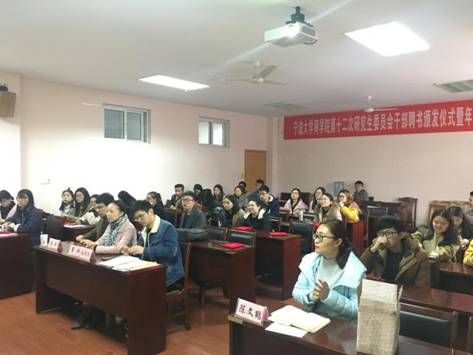 2017年12月29日,四虎影院 第十二届研究生委员会干部聘书颁发仪式暨年度总结大会在418会议室顺利召开。学工办主任董璐、团委书记陈彬、留学生辅导员毛跃祖、研究生辅导员陈文鹤以及全体研会成员出席了本次仪式。
