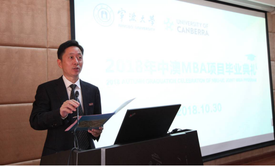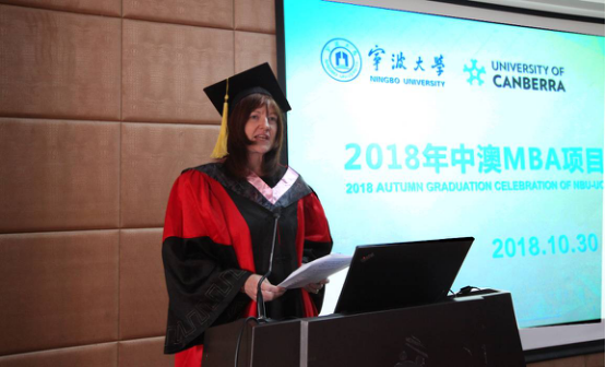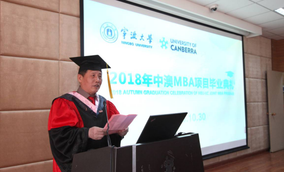 10月30日下午,2018届宁大中澳MBA秋季毕业典礼在四虎影院 109报告厅顺利举行。澳大利亚堪培拉大学商业、政府与法律学院执行院长Maree Sainsbury博士,四虎影院 院长金祥荣教授、党委书记史宏协、副院长盛沛锋、院长助理朱一鸿及项目任课老师和助课老师等出席了本次毕业典礼。除部分已赴堪培拉大学毕业典礼领取毕业证的同学外,有24名毕业学员来现场参加了此次活动。典礼由四虎影院 副院长盛沛锋主持。