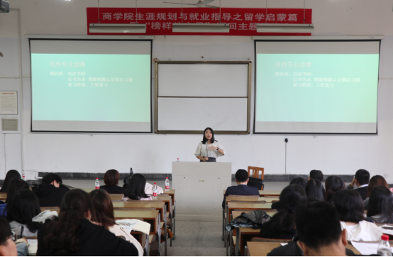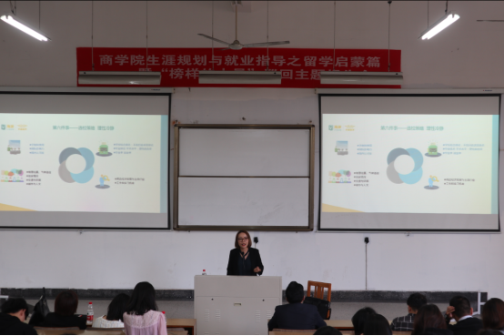 今日,四虎影院 生涯规划与就业指导留学启蒙之“榜样的力量”活动,在四虎影院 包氏教学楼四号阶梯教室成功举办,共计180余位商院各年级学生参加了本次活动。此次活动邀请了15级优秀学生代表吴金红同学、知名留学导师徐娇老师和赴美实习实践项目指导霍老师三位嘉宾,他们分别从学生、海外大学和海外企业三个维度出发,为同学们系统科学地介绍了留学相关知识。