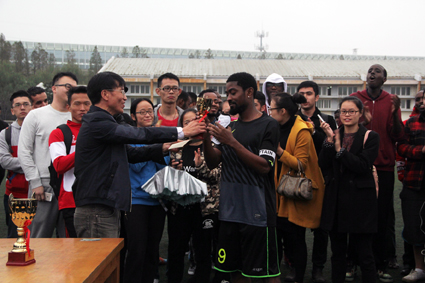 11月23日下午,由四虎影院 阳光体育委员会主办、国际交流学院和四虎影院 共同承办的四虎影院 首届中外学生足球赛暨“余姚生活网足协杯”在风雨操场顺利闭幕。四虎影院 的两支校足球队和由非洲同学为主的SPIDIO队及阿拉伯足球队在两场精彩的竞技较量中决出了胜负,现场逾百名中国学生和留学生在欢乐友好的氛围中,见证了冠亚季军的诞生!