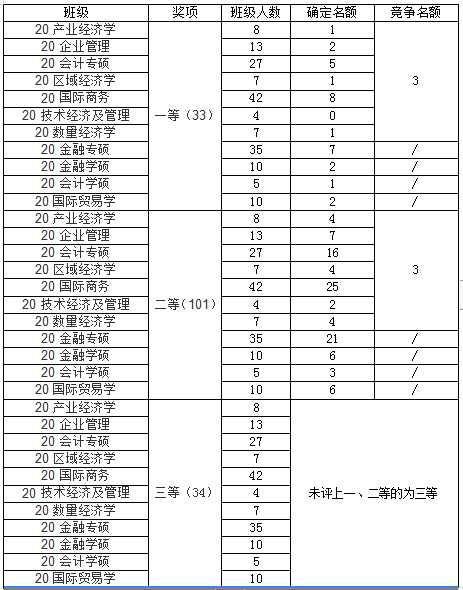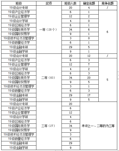 一年级新生采取审核制,不限制一等、二等、三等学业奖学金获奖比例。二、三年级采取评审制,设置一等学业奖学金61名,二等学业奖学金184名,三等学业奖学金61名,具体名额如下: