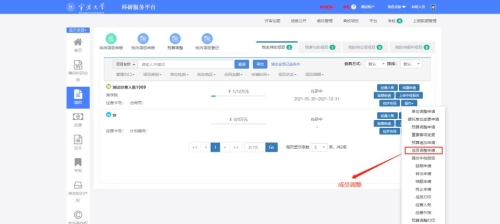 4. 进入项目组成员,请确认成员是否完整。特别是项目中有学生的参与的,请完善学生身份类别。成员信息有问题的,进入科研系统四虎影院,左侧的项目界面,点击操作下拉框下的成员调整申请,进入成员调整界面进行添加和修改,待项目主管审核之后,会自动补充到项目经费公开一览表,最后再提交即可。
